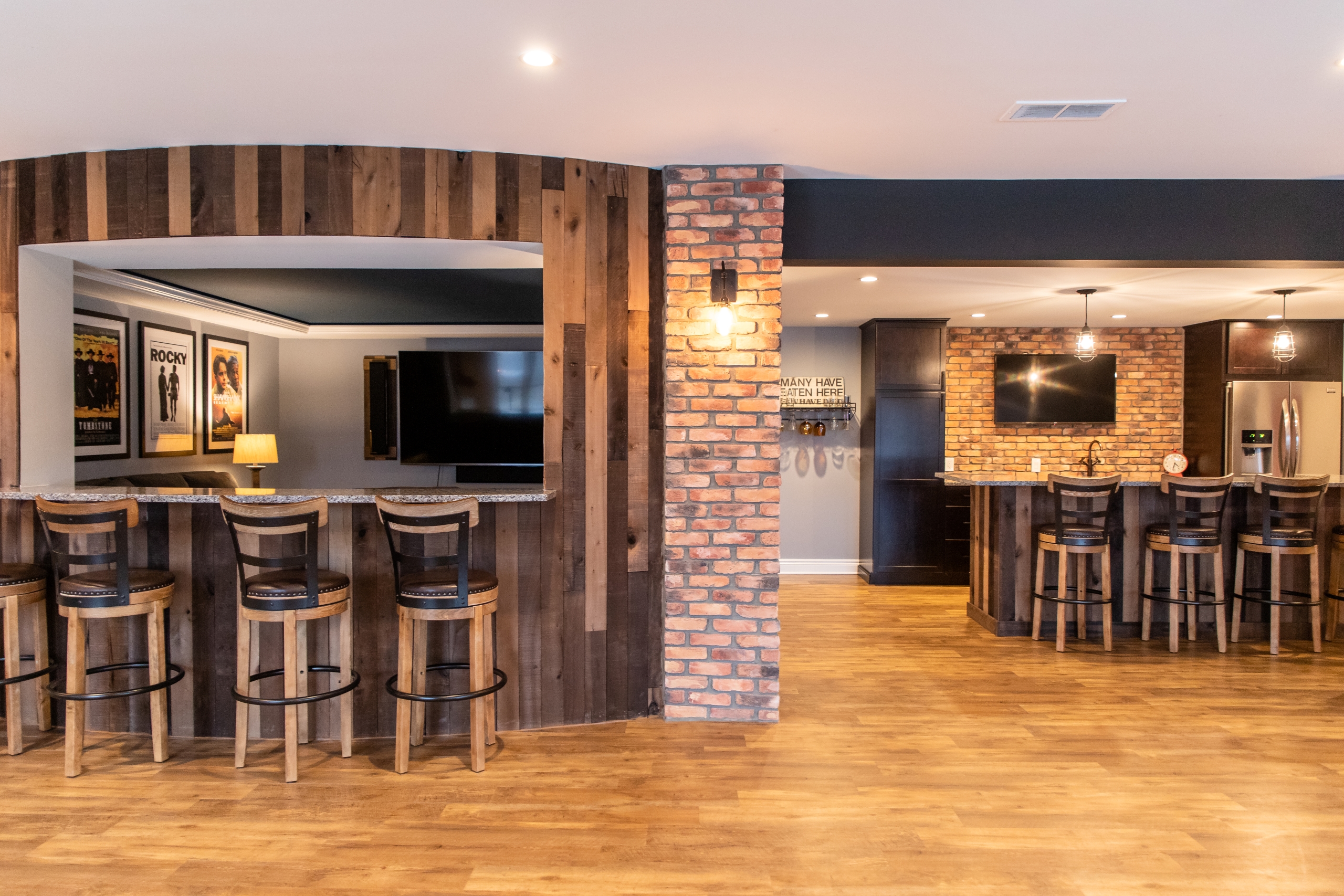 This pub inspired basement was built for the ultimate entertainer and included a rustic kitchen, pool table area, dining area and media room.